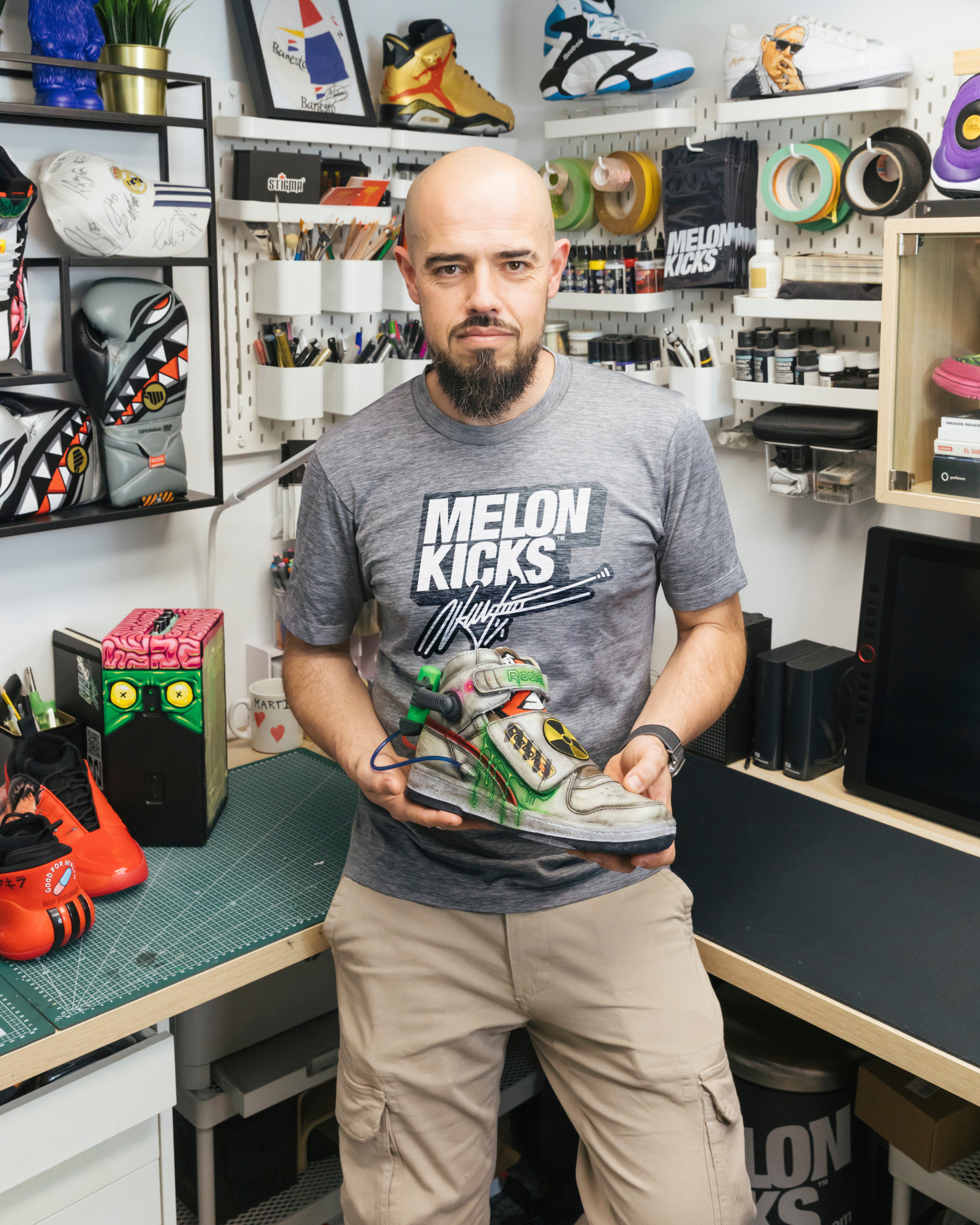 I started customising shoes when I was a child in the 80s-90s because I got bored very fast with the shoes I had at that moment. One of my favourite styles is Manga, but I think I’m a versatile artist. I can also do Realism, Comics, and Colour-ways. I can do leather work, add stitching pieces, or build shoes from scratch.